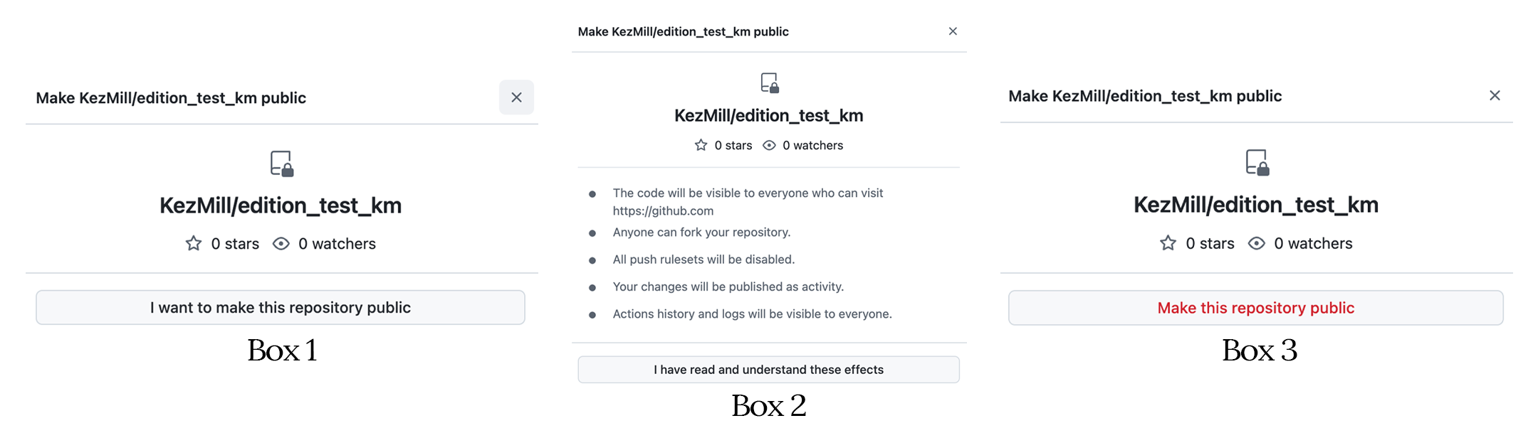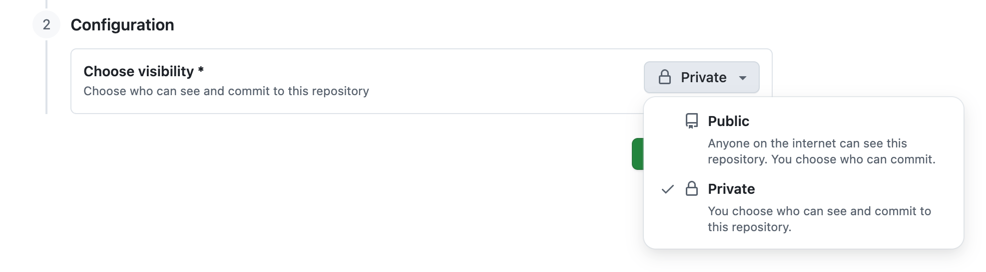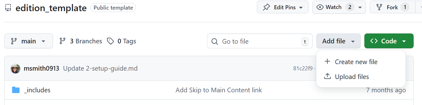 Public: To publish your edition with GitHub Pages, your visibility settings must be set to Public, which can be changed at any time. Refer to Step 5 for instructions on updating visibility settings at a later time.