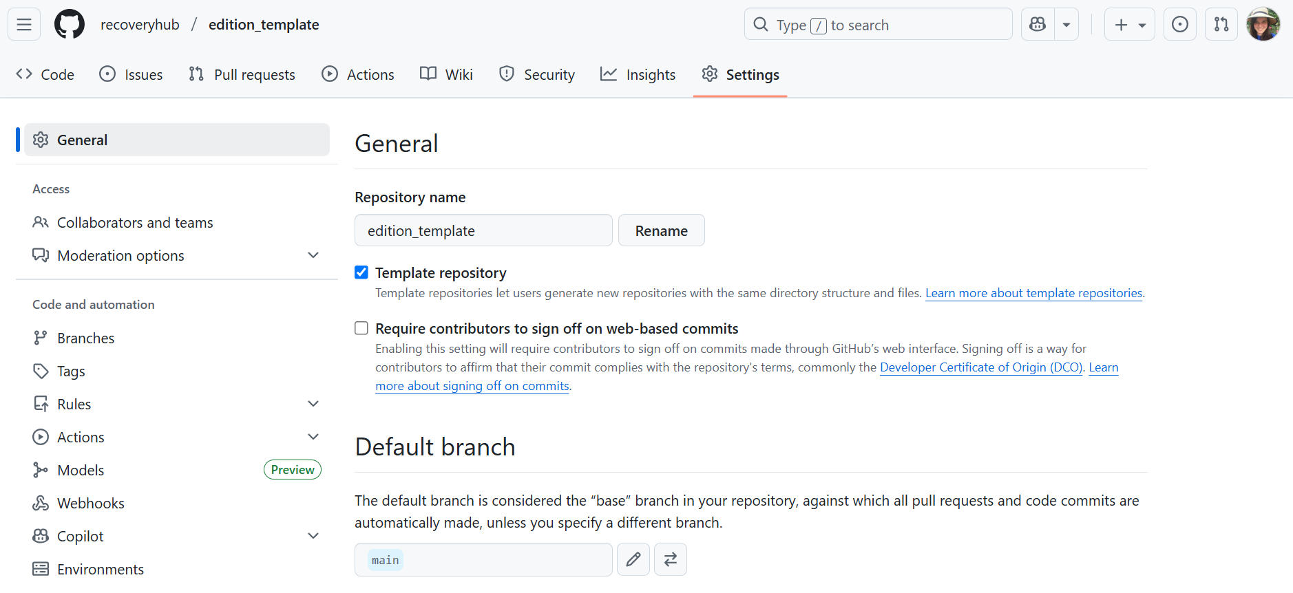 To publish your project edition site with GitHub pages, click “Settings” at the top of your edition’s repository home page. This will direct you to the setting’s “General” page.