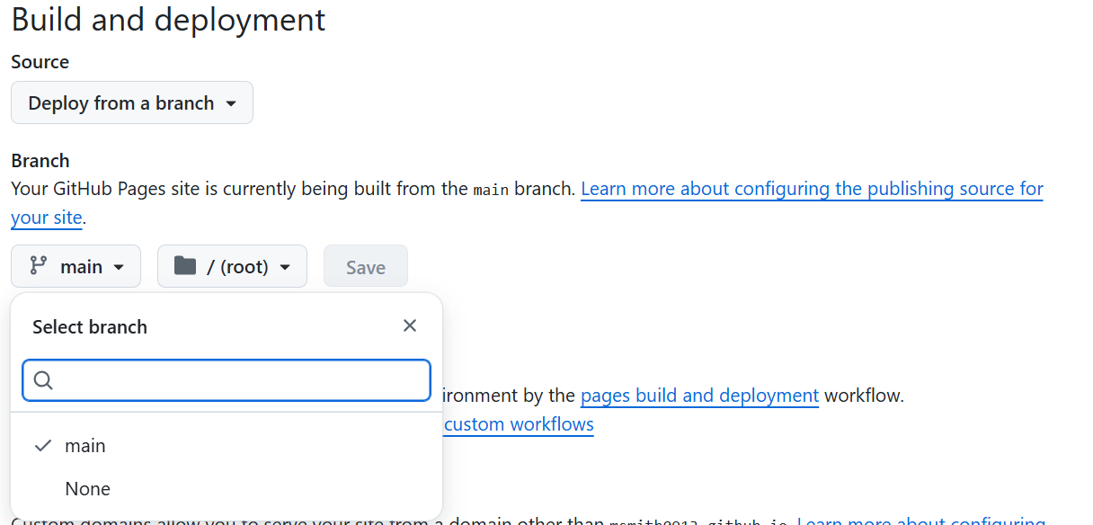 To publish your site with GitHub Pages, find the “Pages” section in the left-hand menu of the Settings page. Click the box that says “None” and select “Main” instead. Click “Save.”