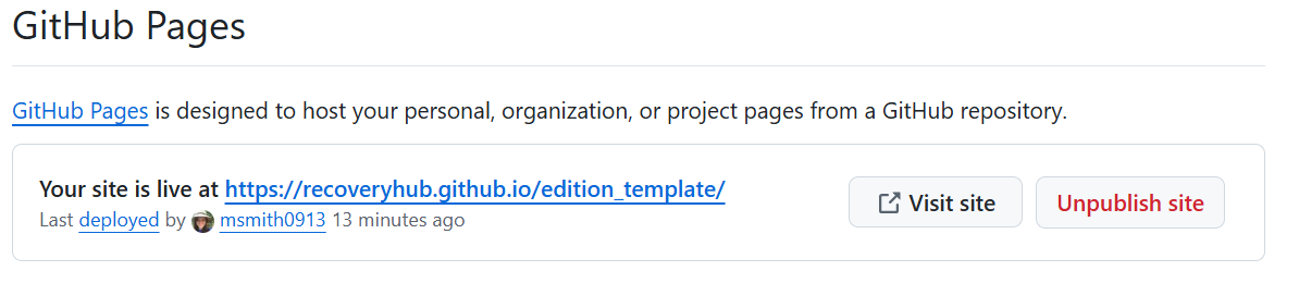 Your site will take several minutes to publish. Once it has completed the deployment process, you’ll find your link both in the Pages settings page.