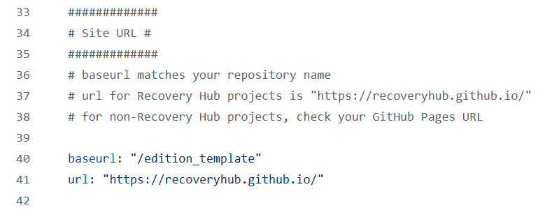 After you switch to edit mode, scroll down to update your URLs, replacing “edition_template” in the base URL with your edition’s repository name and replacing “recoveryhub” in the URL with your GitHub username. See formulas and examples below:
